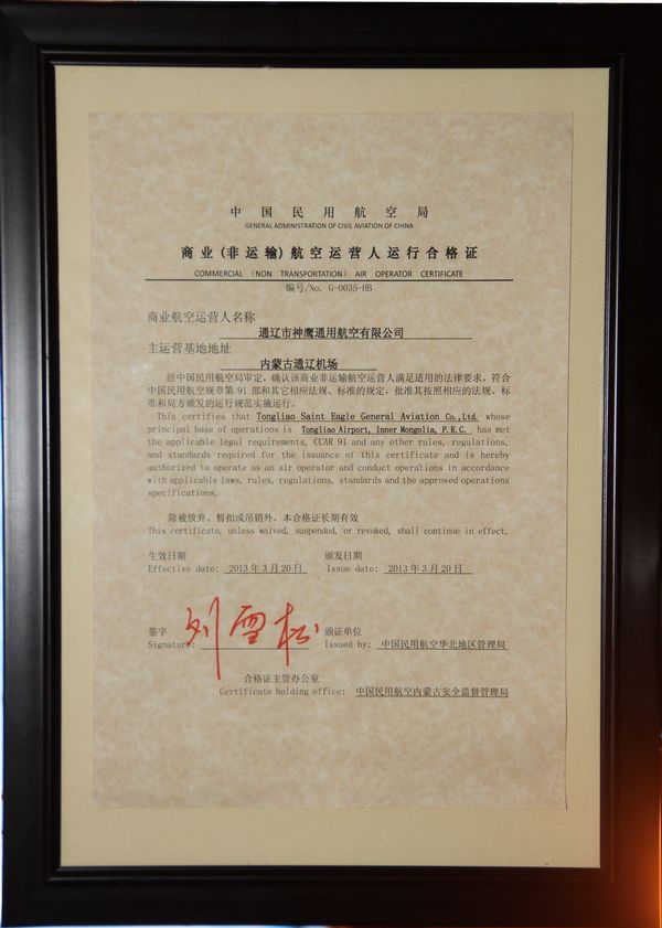 內(nèi)蒙古監(jiān)管局向通遼神鷹通用航空有限公司頒發(fā)證書